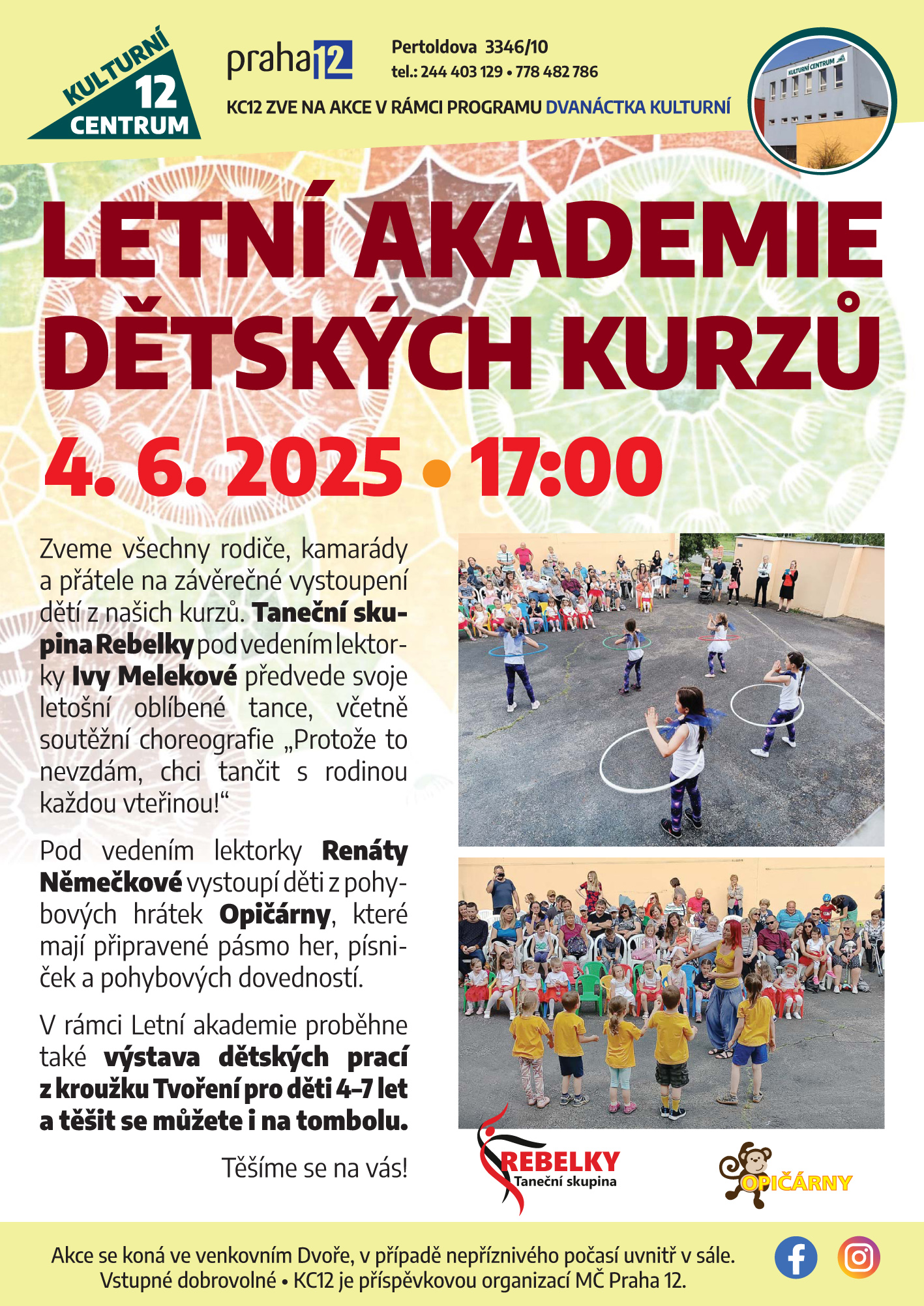 Zveme všechny rodiče, kamarády a přátele na závěrečné vystoupení dětí z našich kurzů. Taneční skupina Rebelky pod vedením lektorky Ivy Melekové předvede svoje letošní oblíbené tance, včetně soutěžní choreografie Protože to nevzdám, chci tančit s rodinou každou vteřinou!