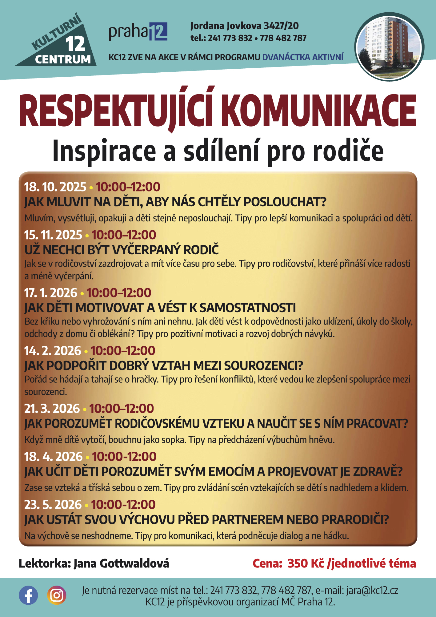 Cítíte, že rodičovství je někdy náročné a pomohlo by vám s někým sdílet své myšlenky a zkušenosti? Přijďte načerpat inspiraci, podpořit se vzájemně s dalšími rodiči. Pravidelné měsíční setkávání zaměřené na respektující výchovu. Tentokrát na téma: Jak mluvit na děti, aby nás chtěly poslouchat? Mluvím, vysvětluji, opakuji a děti neposlouchají. Tipy pro lepší komunikaci a spolupráci od dětí.