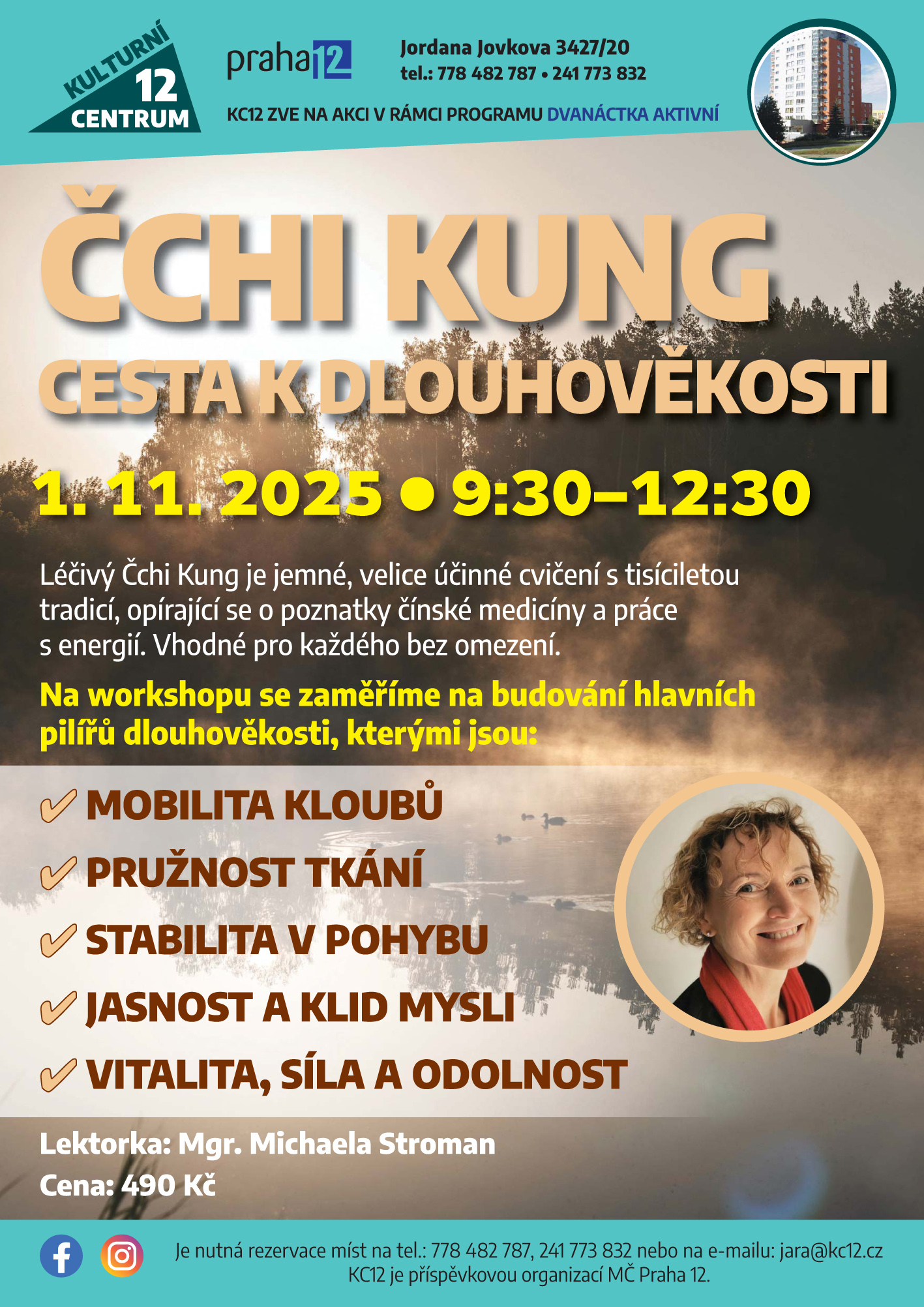 Léčivý Čchi Kung je jemné, velice účinné cvičení s tisíciletou tradicí, opírající se o poznatky čínské medicíny a práce s energií. Vhodné pro každého bez omezení. Na workshopu se zaměříme na budování hlavních pilířů dlouhověkosti, kterými jsou: mobilita kloubů, průžnost tkání, stabilita v pohybu, jasnost a klid mysli, vitalita, síla a odolnost. Vhodné pro každého bez omezení.