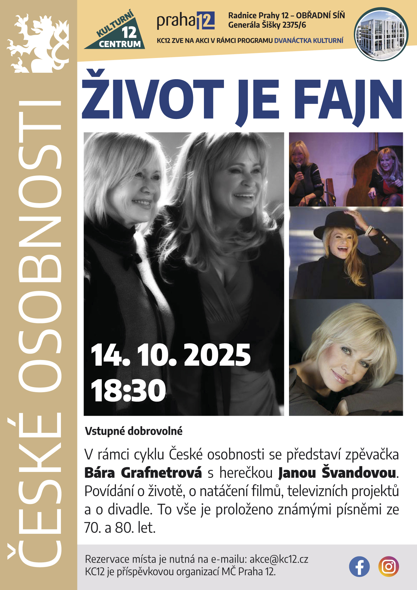 V rámci cyklu České osobnosti se představí zpěvačka Bára Grafnetrová s herečkou Janou Švandovou. Těšit se můžete na povídání o životě, o natáčení filmů, televizních projektů a o divadle. To vše je proloženo známými písněmi ze 70. a 80. let.