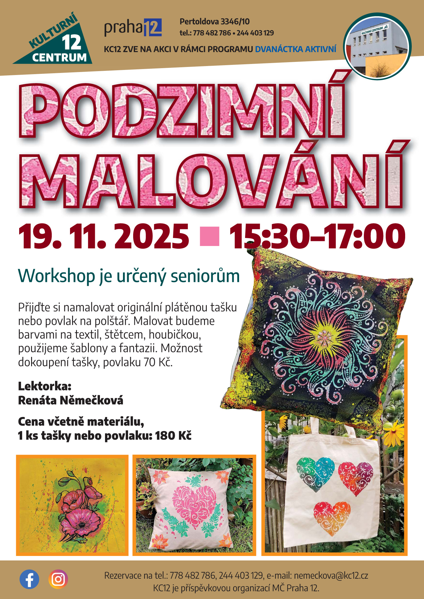 Přijďte si namalovat originální plátěnou tašku nebo povlak na polštář. Malovat budeme barvami na textil, štětcem, houbičkou, použijeme šablony a fantazii. Možnost dokoupení tašky nebo povlaku na místě 70 Kč.