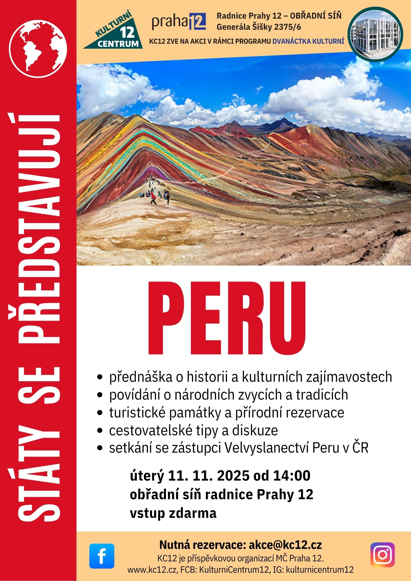 KC12 a MČ Praha 12 ve spolupráci s Velvyslanectvím Peruánské republiky srdečně zvou na poutavou přednášku v rámci cyklu „Státy se představují“. Opět zavítáme do Jižní Ameriky, tentokrát poznat krásy a zajímavosti Peru. Prezentace bude zahrnovat nejen informace o reáliích, ale také zajímavosti o kultuře, národních tradicích a způsobech života tamního obyvatelstva.