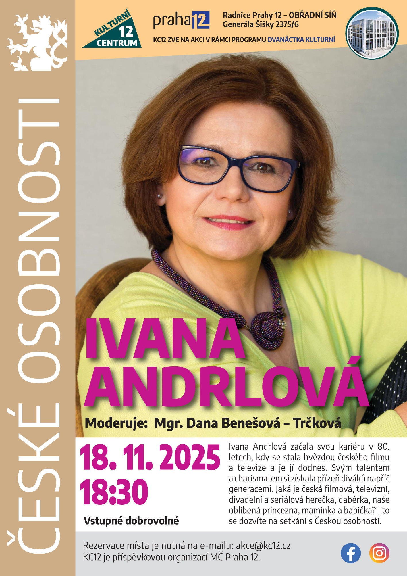V rámci cyklu České osobnosti vás srdečně zveme na setkání s Ivanou Andrlovou. Jaká je česká filmová, televizní, divadelní a seriálová herečka, dabérka, naše oblíbená princezna, maminka a babička nyní? I to se dozvíte. Pořadem bude provázet Mgr. Dana Benešová – Trčková.