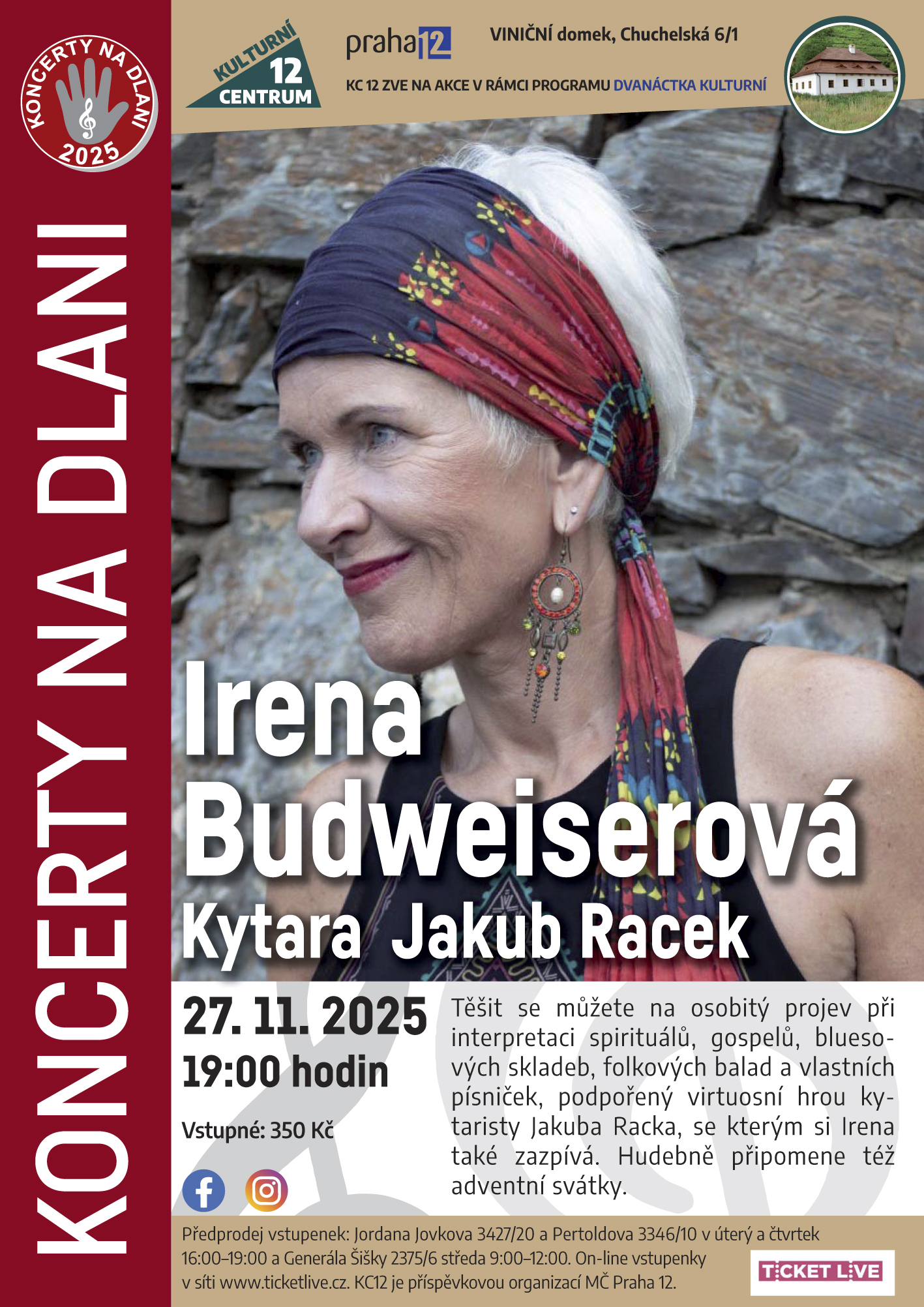 Přijďte si do Viničního domku na Praze 12 poslechnout jedinečné vystoupení Ireny Budweiserové s vynikajícím kytaristou Jakubem Rackem a příjemně tak zahájit v rámci Koncertů na dlani adventní čas. Uslyšíte nejen bluesové skladby, folkové balady a písničky, ale i spirituály a gospely.