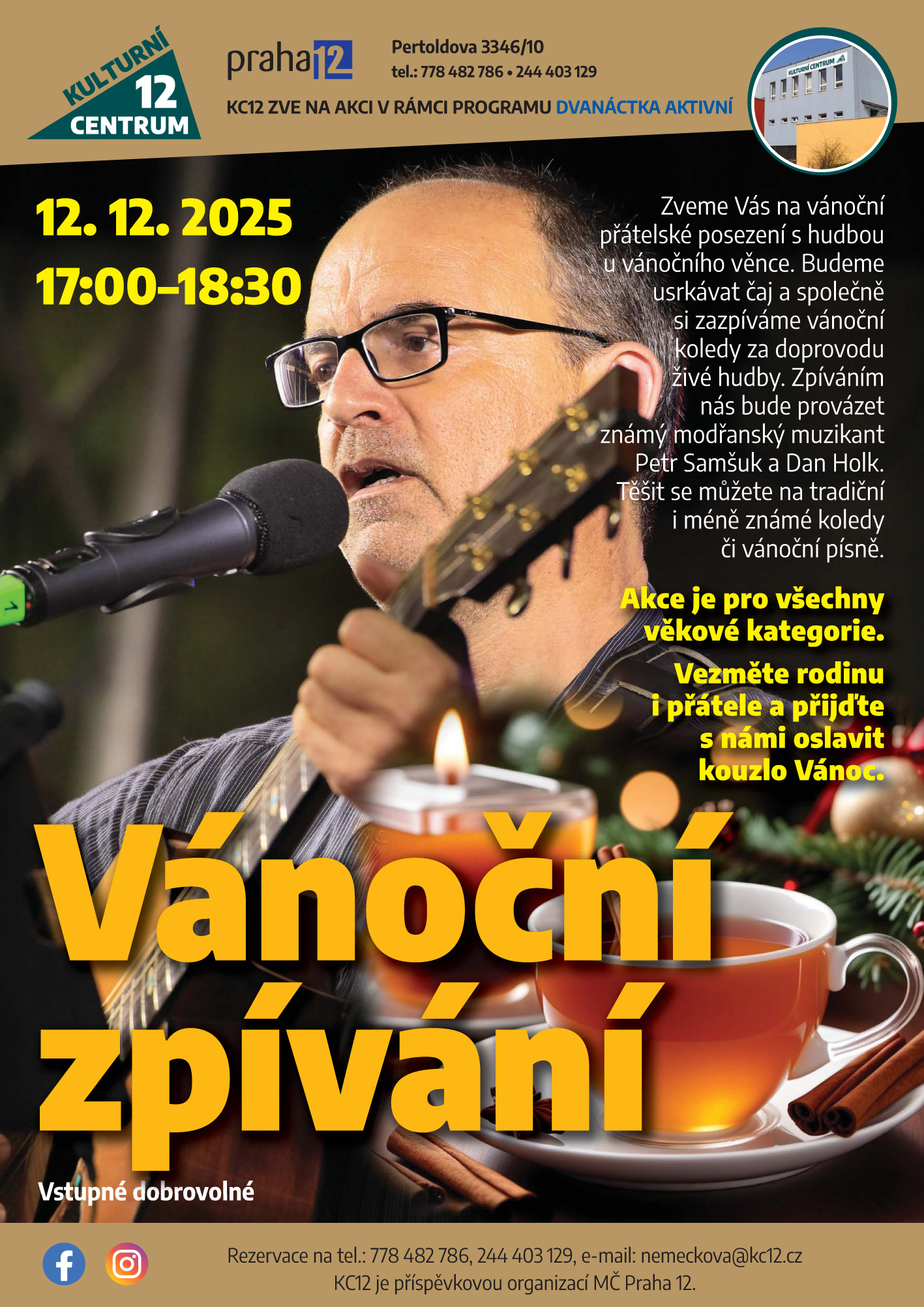 Zveme Vás na vánoční přátelské posezení s hudbou u vánočního věnce. Budeme usrkávat čaj a společně si zazpíváme vánoční koledy za doprovodu živé hudby. Zpíváním nás bude provázet známý modřanský muzikant Petr Samšuk a Dan Holc. Těšit se můžete na tradiční i méně známé koledy či vánoční písně.