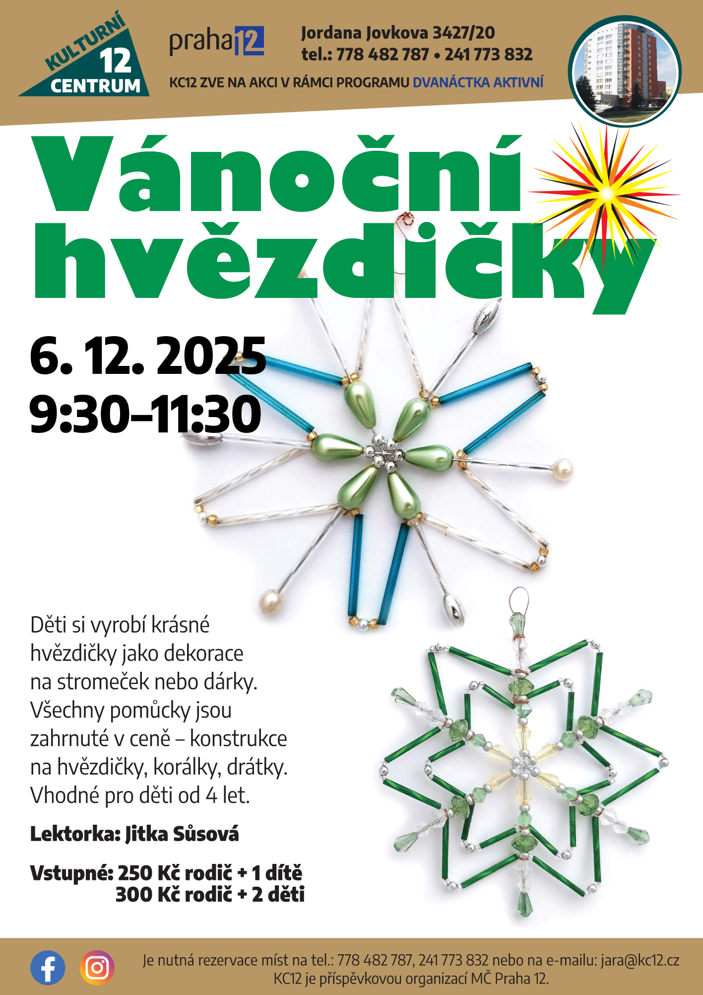 Děti si vyrobí krásné hvězdičky jako dekorace na stromeček nebo dárky. Všechny pomůcky – konstrukce na hvězdičky, korálky, drátky budou na kurzu k dispozici.