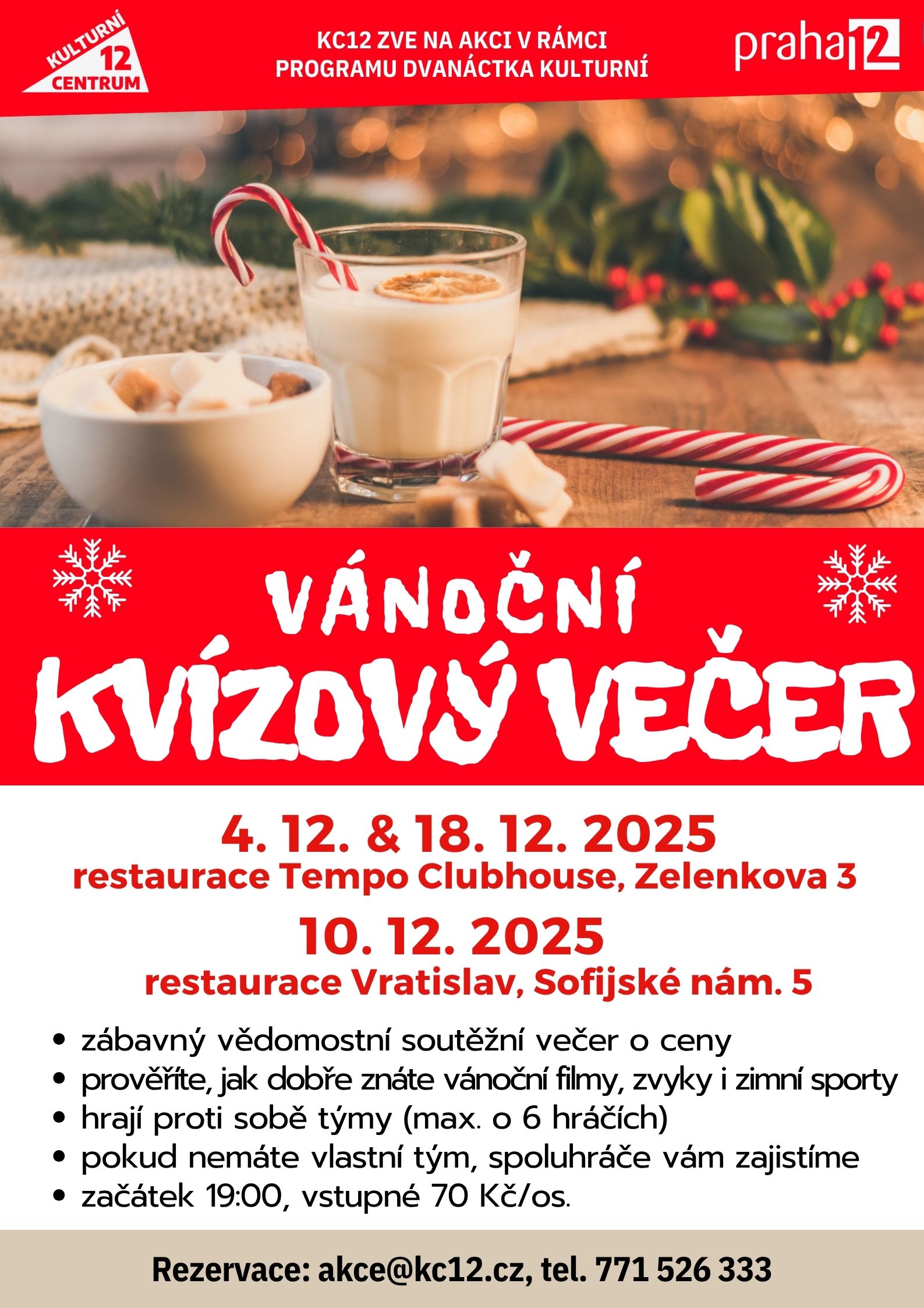 čtvrtek 18. 12. 2025 od 19:00 do cca 21:30 restaurace Tempo Clubhouse, Zelenkova 3