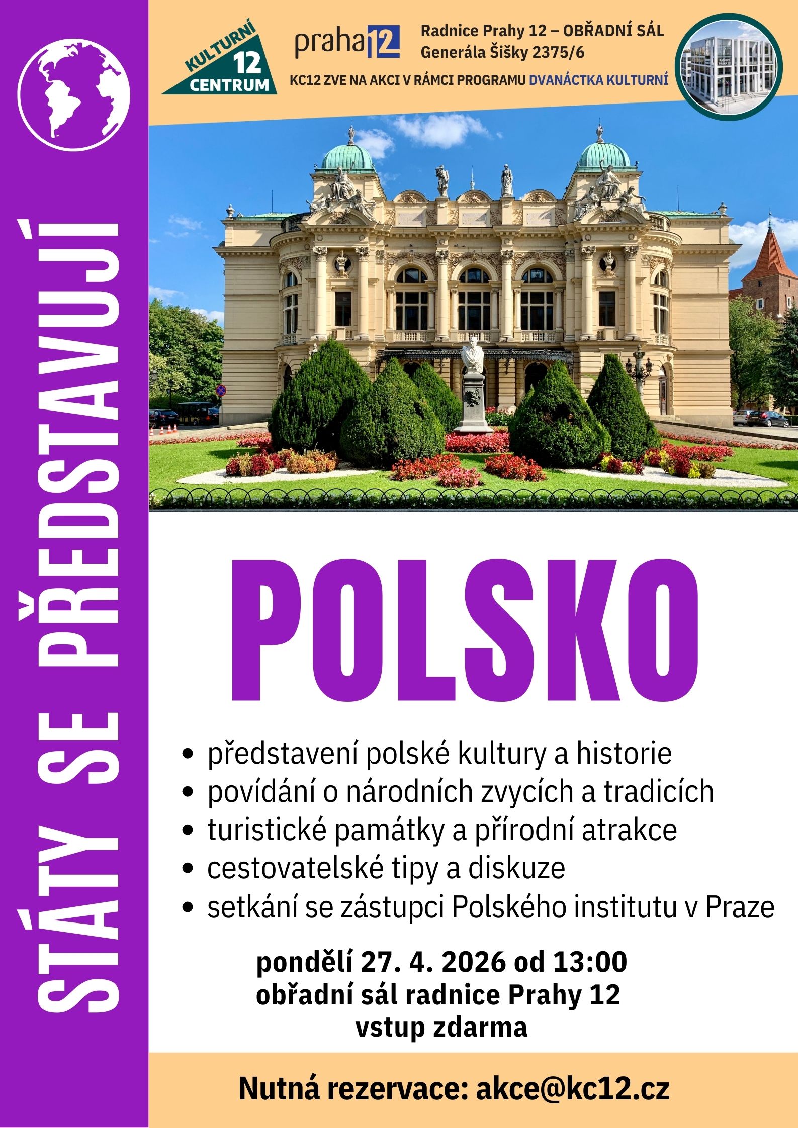 Ve spolupráci s Polským institutem vás srdečně zveme na přednášku věnovanou Polsku. Seznámíte se s jeho geografickými zajímavostmi a turistickými cíli, poznáte významné polské osobnosti a nahlédnete do bohaté kultury a tradic této země. Dotkneme se také historie česko-polských vztahů. Součástí programu bude i otevřená diskuse s posluchači.