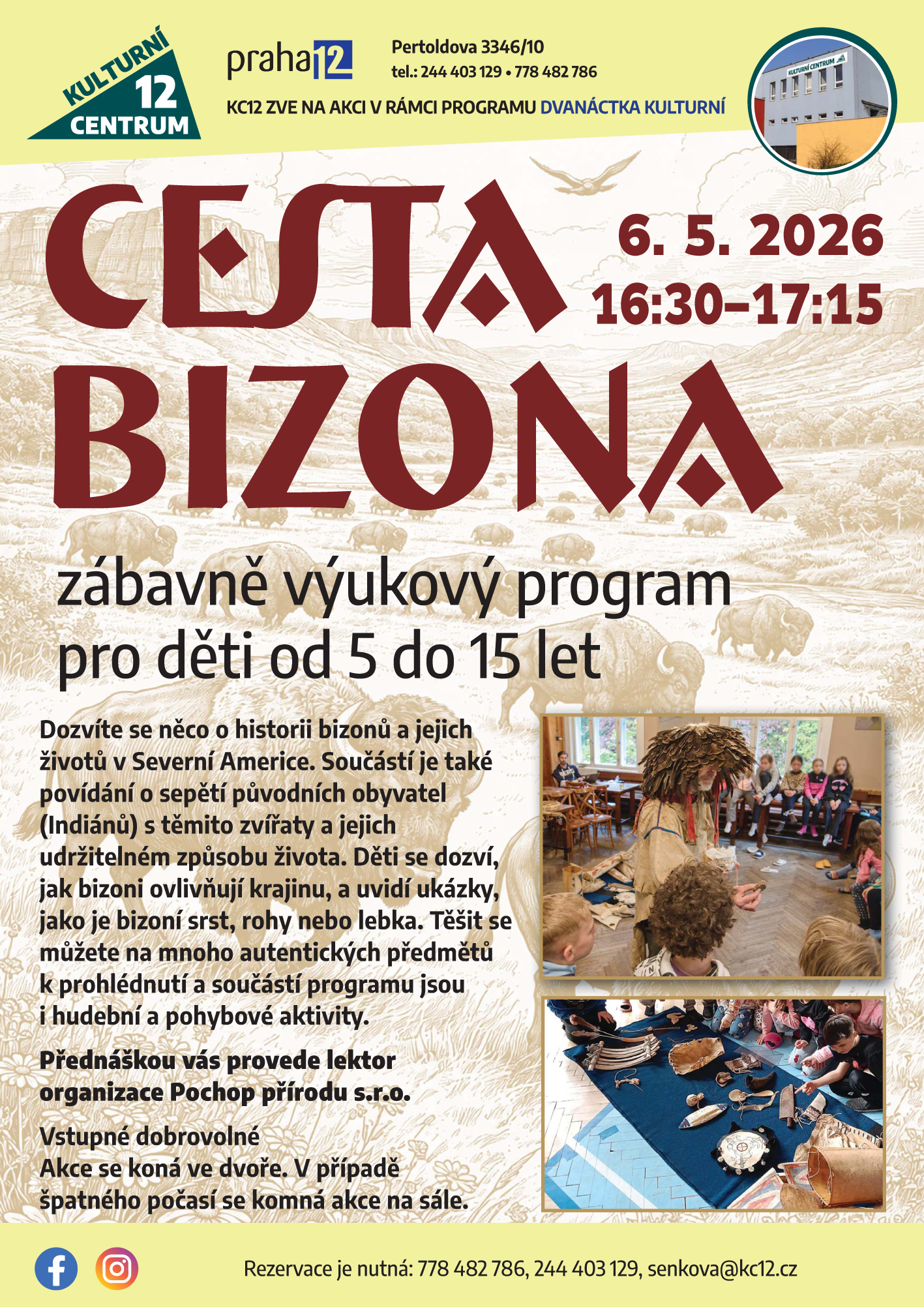 Rezervace je nutná: 778 482 786, 244 403 129, nemeckova@kc12.cz