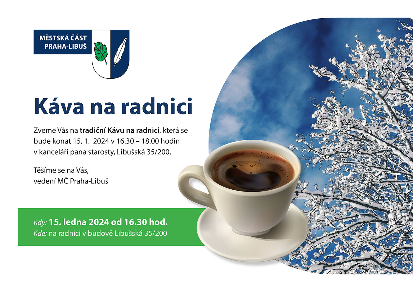 Zveme Vás na tradiční Kávu na radnici, která se bude konat 15. 1. 2024 v 16.30 - 18.00 hodin v kanceláři pana starosty, Libušská 35/200.
